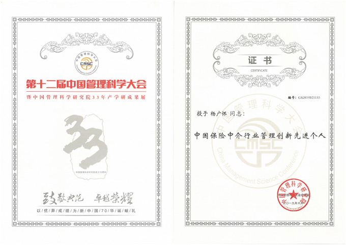 中国保险中介行业管理创新先进个人-证书